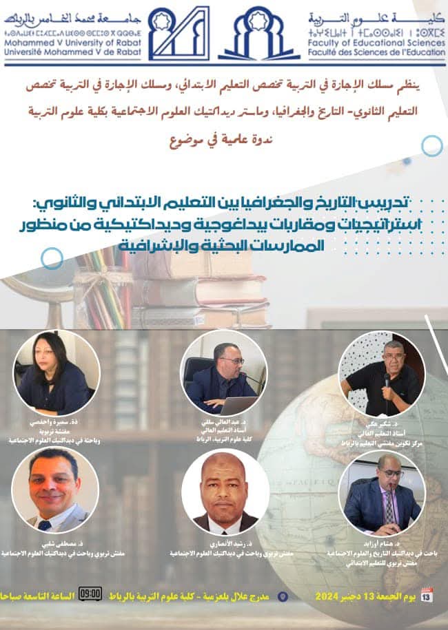 نظم مسلك "الإجازة في التربية" تخصص "التعليم الابتدائي" ومسلك “الإجازة في التربية “ تخصص “التعليم الثانوي التاريخ والجغرافيا”، وماستر “ديداكتيك العلوم الاجتماعية“ يوم الجمعة 13 دجنبر 2024، ندوة وطنية في موضوع "تدريس التاريخ والجغرافيا بالتعليم الابتدائي والثانوي من منظور المقاربات البحثية والاشرافية".