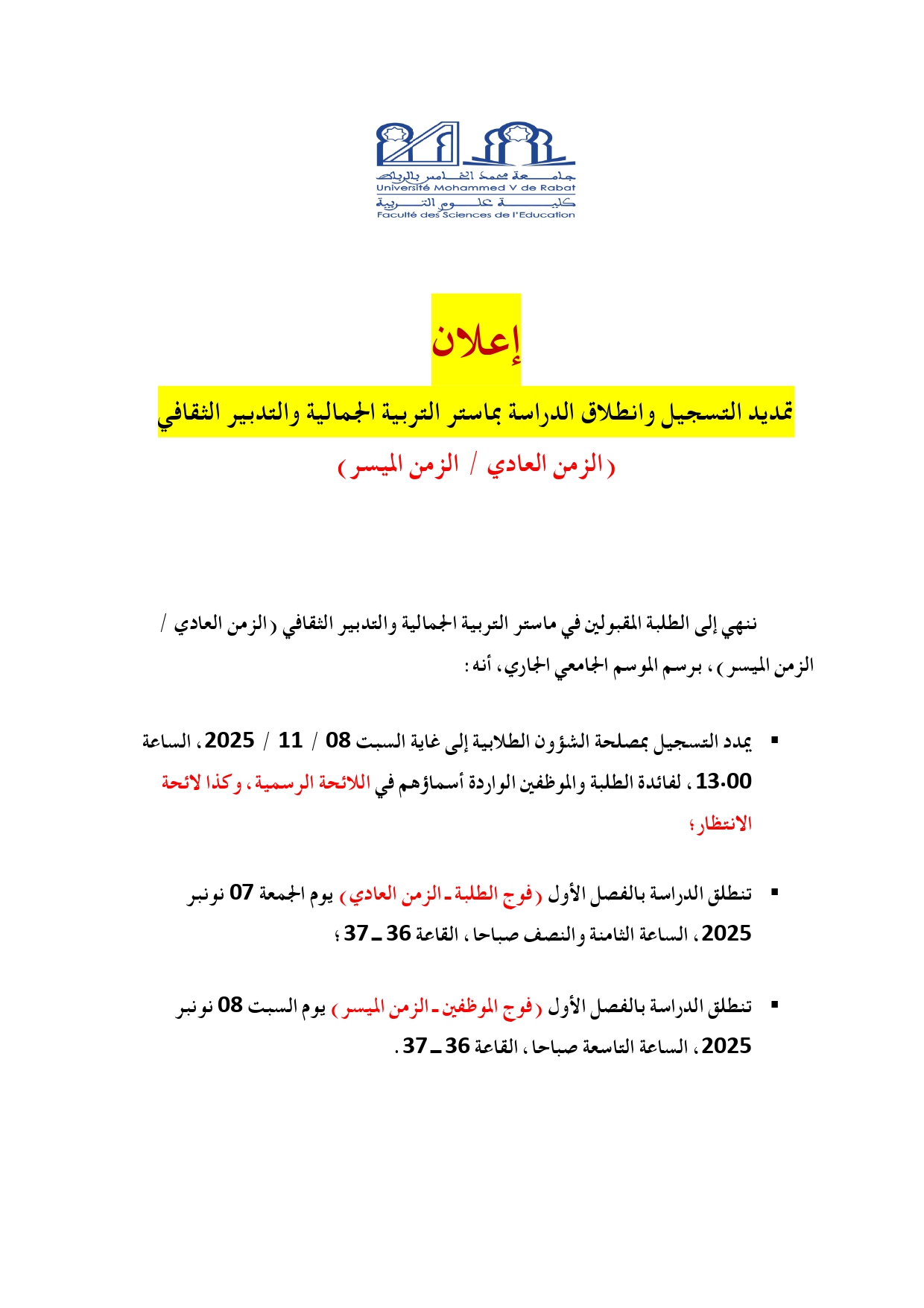 تمديد التسجيل وانطلاق الدراسة بماستر التربية الجمالية والتدبير الثقافي (الزمن العادي / الزمن الميسر)