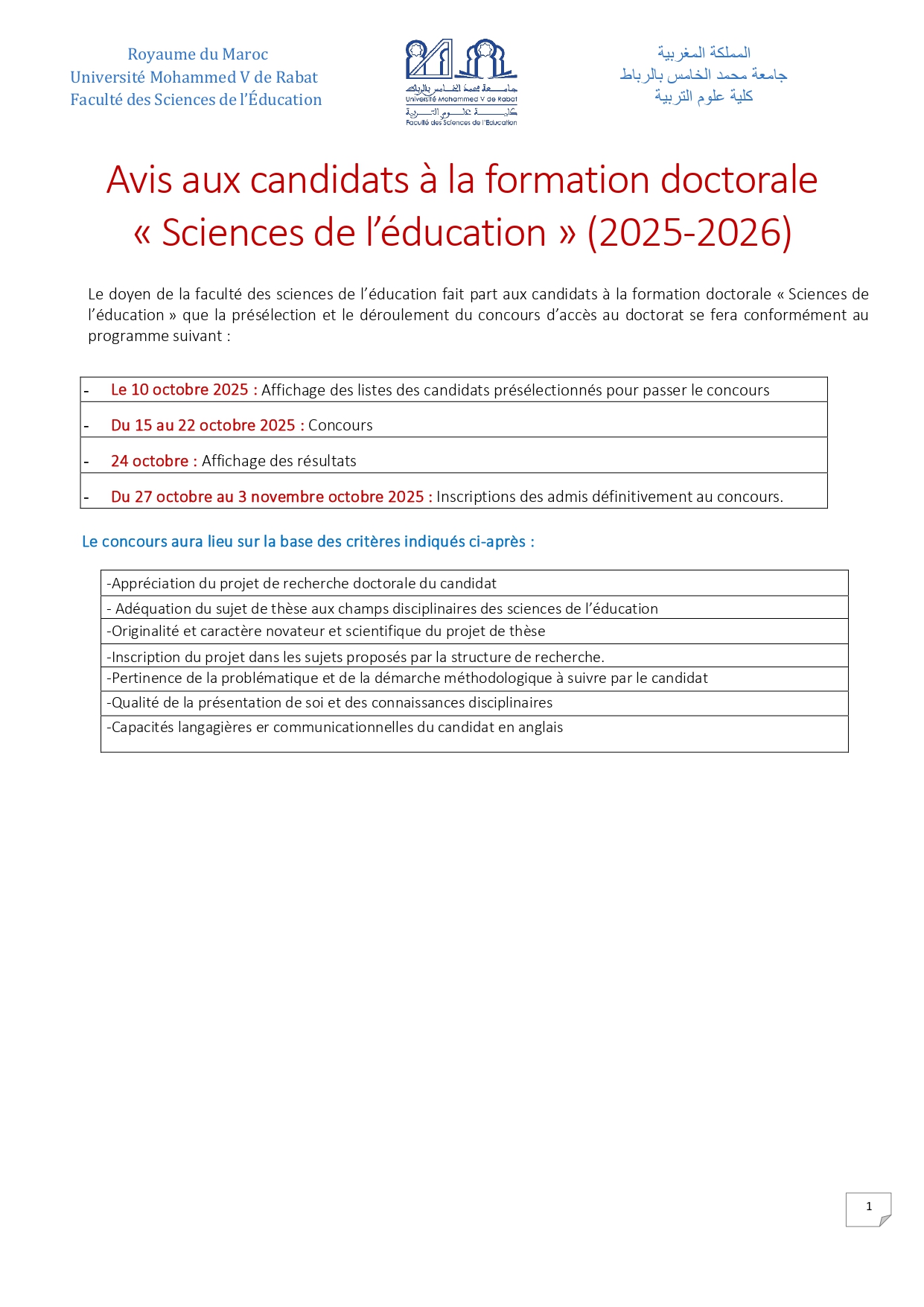 Avis aux candidats à la formation doctorale « Sciences de l’éducation » (2025-2026)